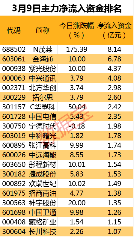 科创板“大肉签”新股N茂莱获主力资金净流入8.14亿元居首。该股今日盘中一度涨逾201.2%,最终收涨175.39%,经计算,投资者中一签最多可赚7.01万元。