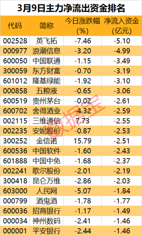 其后,净卖出居前的个股为浪潮信息、中国联通、东方财富、隆基绿能、五粮液,净流出资金均超3亿元。
