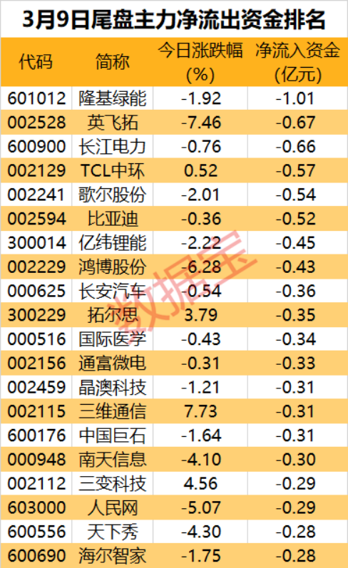数据宝统计,尾盘6股遭主力出逃超5000万元,其中隆基绿能尾盘净流出金额逾1亿元。