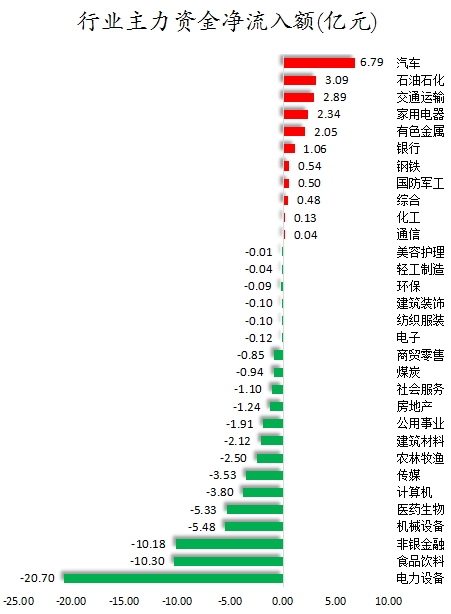从行业来看,申万所属的31个一级行业,今日有11个行业主力资金呈现净流入,其中,汽车行业主力资金净流入最多,净流入金额为6.79亿元;行业主力资金净流入居前的还有石油石化、交通运输、家用电器,净流入金额分别为3.09亿元、2.89亿元、2.34亿元。20个行业主力资金呈现净流出,其中,电力设备行业主力资金净流出最多,净流出金额为20.7亿元;行业主力资金净流出靠前的还有食品饮料、非银金融、机械设备、医药生物、计算机,净流出金额分别为10.3亿元、10.18亿元、5.48亿元、5.33亿元、3.8亿元。