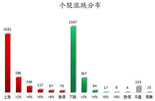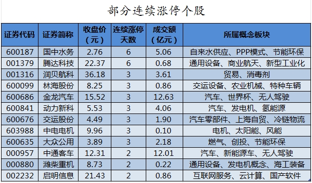 截至收盘,沪深两市合计2281只个股上涨,2567只个股下跌,平盘个股235只,停牌的个股23只。不含当日上市新股,共有76只个股涨停,4只个股跌停。连续涨停天数看,国中水务、腾达科技均已连收6个涨停板,连续涨停板数量最多。