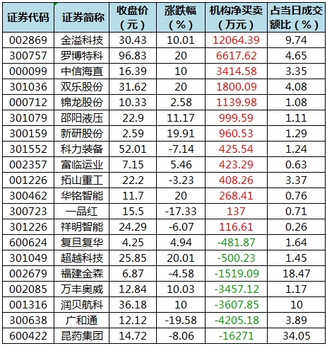 盘后龙虎榜数据显示,今日机构席位资金合计净卖出约1266.45万元。其中,净买入的个股13只,净卖出的个股7只。机构净买入最多的股票是金溢科技,净买入金额约1.21亿元;机构净买入居前的还有罗博特科、中信海直、双乐股份等股。机构净卖出最多的股票是昆药集团,净卖出金额约1.63亿元;机构净卖出居前的还有广和通、润贝航科等股。
