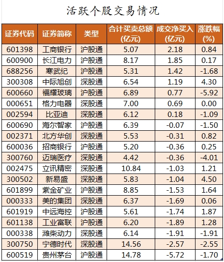 活跃个股方面,北向资金今日净买入较多的有工商银行、长江电力、寒武纪、中际旭创、福耀玻璃,净买入金额分别为2.18亿元、1.85亿元、1.42亿元、1.19亿元、0.77亿元。北向资金净卖出较多的有贵州茅台、宁德时代、潍柴动力、工业富联、中远海控,净卖出金额分别为5.72亿元、2.57亿元、1.91亿元、1.89亿元、1.74亿元。