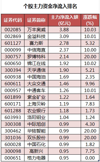 个股来看,今日有2012只个股获主力资金净流入,其中,14股获主力资金净流入超1亿元。万丰奥威主力资金净流入最多,净流入金额为3.88亿元;主力资金净流入居前的个股还有金溢科技、赛力斯、中信海直、罗博特科、锦江在线,净流入金额分别为3.09亿元、2.78亿元、2.37亿元、2.14亿元、1.92亿元。
