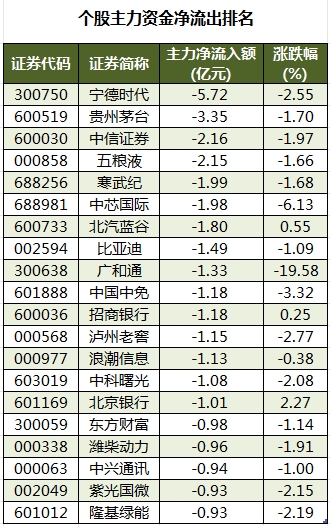 此外,3013只个股被主力资金净卖出,其中,15股被主力资金净卖出超1亿元。主力资金净流出最多的个股是宁德时代,净流出金额为5.72亿元;主力资金净流出居前的个股还有贵州茅台、中信证券、五粮液、寒武纪、中芯国际,净流出金额分别为3.35亿元、2.16亿元、2.15亿元、1.99亿元、1.98亿元。