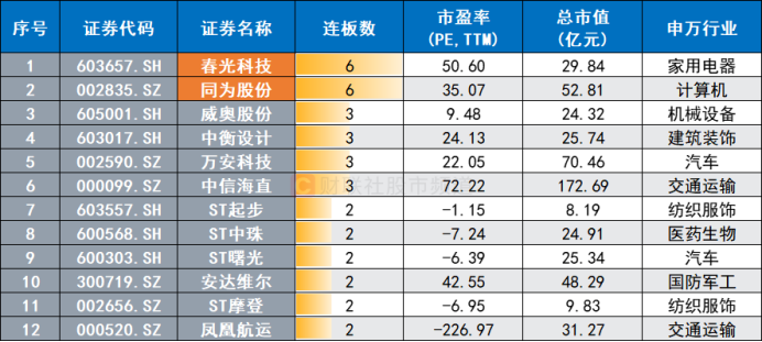 分行业(申万一级)来统计,不计算ST股,截至4月19日数据,目前连板股所属行业主要涵盖交通运输、汽车、建筑装饰、家用电器、计算机、机械设备、国防军工七大板块,其中,交通运输股相对偏多。此外,目前连板股以小盘股居多,其近半总市值不足50亿元,仅有中信海直、万安科技、同为股份市值相对偏高,分别达172亿元、70亿元、51亿元。