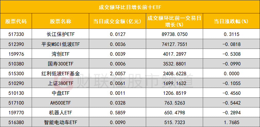 从成交额环比增长前十的ETF来看,居前的标的基本没有什么亮点,基本都是成交额比较小的etf。