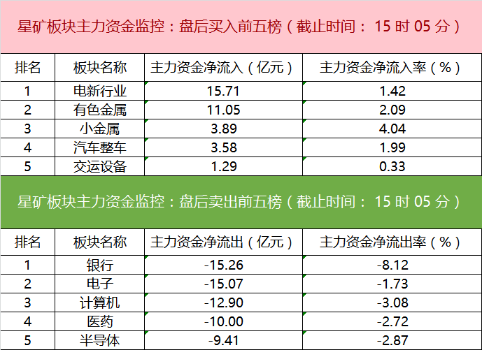 从主力板块资金监控数据来看,电新行业以净流入15.71亿元居首,有色金属11.05亿元次之,汽车整车板块也有3.58亿元。