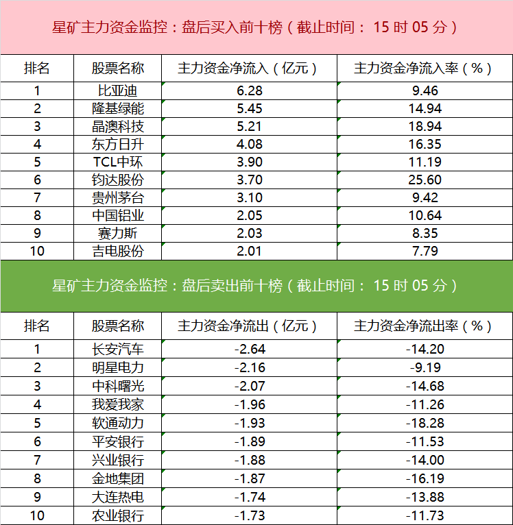 从个股主力资金监控数据来看,前十个股主要集中在新能源方向,比亚迪净流入6.28亿元居首,隆基绿能、晶澳科技也超过5亿元,东方日升、TCL中环、均达股份、贵州茅台超3亿元。