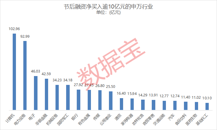 以申万一级行业划分,共计19个板块融资净买入额破10亿元。其中,计算机与电力设备融资净买入额居前,分别为102.96亿元、92.99亿元;电子、非银金融次之,均逾40亿元;另有机械设备、国防军工、银行、有色金属、传媒和公用事业融资净买入额在20亿元以上。