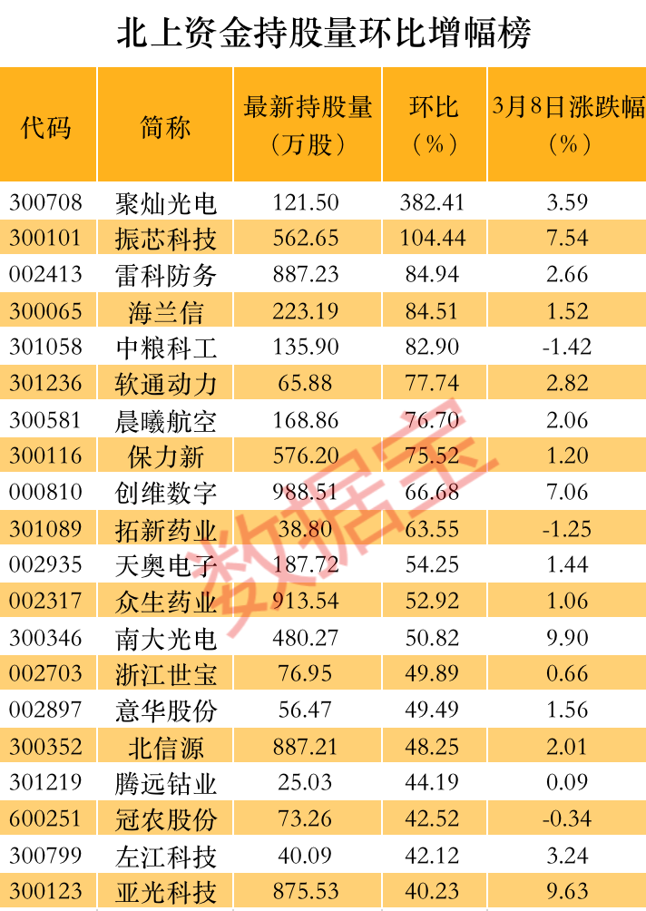 增仓幅度来看,持股量环比增幅在30%以上的共有34只,环比增幅最大的是聚灿光电,北上资金最新持有121.5万股,持股量环比增幅达382.41%,昨日该股上涨3.59%,全天换手率为2.07%,主力资金净流出590.88万元;其次是振芯科技、雷科防务,北上资金最新持股量分别为562.65万股、887.23万股,环比增幅为104.44%、84.94%,位居增仓榜第二、第三位。