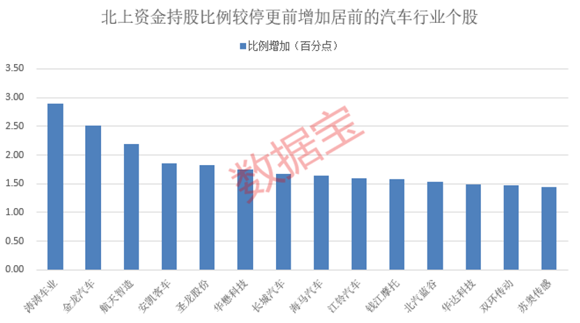 涛涛车业、金龙汽车、航天智造的北上资金持股比例均较8月16日增长超2个百分点。