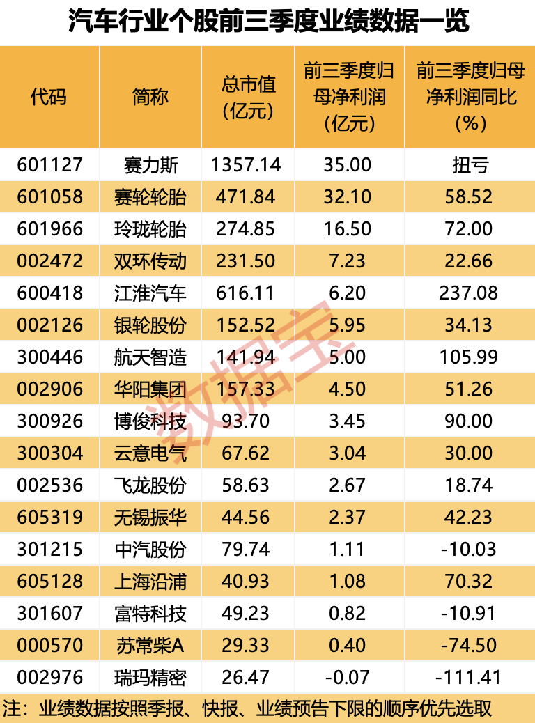 截至目前,共有17只汽车股发布了今年前三季度业绩预告、快报或三季报;综合预告下限和快报、季报数据来看,大多数汽车行业个股前三季度业绩均实现较为可观的增长,目前赛力斯、赛轮轮胎、玲珑轮胎的前三季度净利润规模居前。