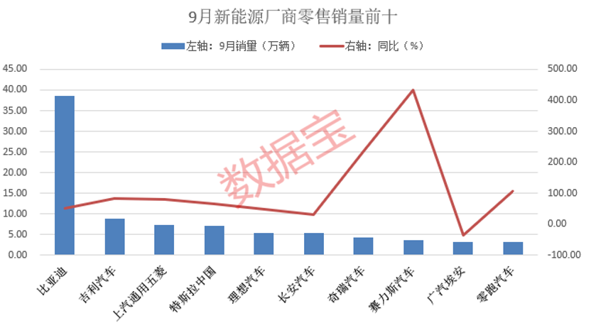 比亚迪以38.7万辆的零售销量蝉联榜首,同比增长50.1%。吉利汽车和上汽通用五菱分别位列二、三位,同比增幅均超80%。