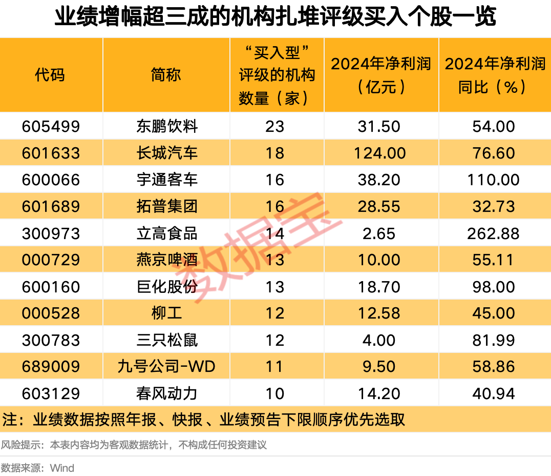 综合业绩预告下限、快报、年报数据来看,获得10家及以上机构给予“买入型”评级的个股中,有11股2024年业绩实现盈利且同比增幅超30%。
