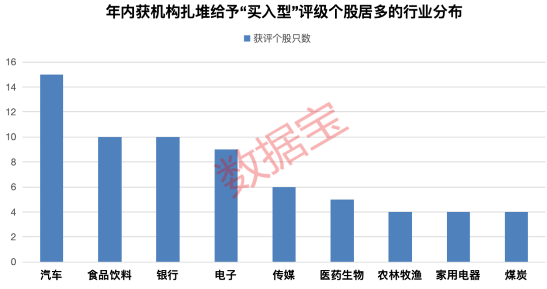 参评机构在5家及以上的个股有99只,以申万一级行业划分,汽车、食品饮料、银行板块获评个股数量居前,分别有15只、10只和10只;电子、传媒、医药生物上榜个股均超5只,上述六大板块个股合计占比过半。