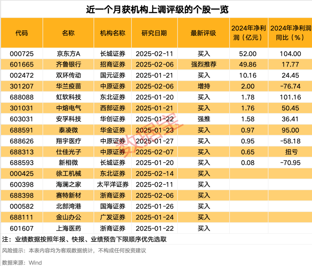 获得上调评级的个股中,仕佳光子2024年业绩预计扭亏;京东方A、虹软科技、泰凌微、中熔电气净利润增速居前,均超50%。