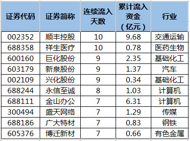 数据宝统计,截至4月19日收盘,沪深两市共有56只个股连续5日或5日以上主力资金净流入。连续流入天数最多的是顺丰控股、祥生医疗,均已连续10个交易日净流入。连续净流入天数较多的还有巨化股份、新泉股份、兴化股份、永信至诚、金山办公,分别获9个、9个、9个、8个、7个交易日净流入。