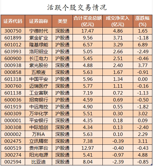 活跃个股方面,北向资金今日净买入较多的有宁德时代、紫金矿业、隆基绿能、洛阳钼业、长江电力,净买入金额分别为4.86亿元、3.71亿元、3.29亿元、2.66亿元、2.51亿元。北向资金净卖出较多的有比亚迪、阳光电源、贵州茅台,净卖出金额分别为2.39亿元、0.97亿元、0.4亿元。