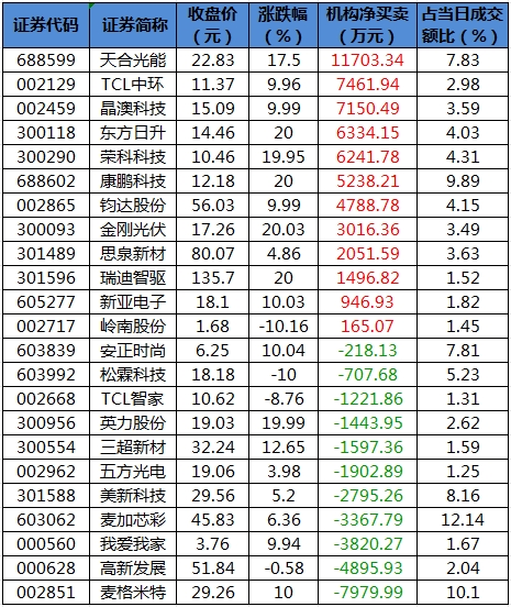 盘后龙虎榜数据显示,今日机构席位资金合计净买入约2.66亿元。其中,净买入的个股12只,净卖出的个股11只。机构净买入最多的股票是天合光能,净买入金额约1.17亿元;机构净买入居前的还有TCL中环、晶澳科技、东方日升等股。机构净卖出最多的股票是麦格米特,净卖出金额约7979.99万元;机构净卖出居前的还有高新发展、我爱我家等股。