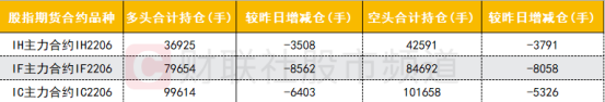 今日三大期指主力合约多空双方均减仓,其中IH主力合约空头减仓数量大于多头,IF和IC主力合约多头减仓数量均大于空头。