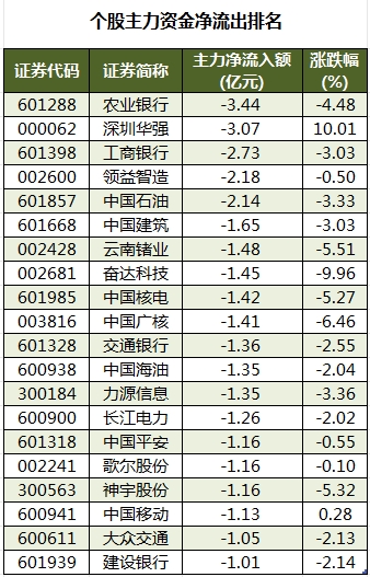 今日有2844只个股被主力资金净卖出,其中,20股被主力资金净卖出超1亿元。主力资金净流出最多的个股是农业银行,净流出金额为3.44亿元;主力资金净流出居前的个股还有深圳华强、工商银行、领益智造、中国石油、中国建筑,净流出金额分别为3.07亿元、2.73亿元、2.18亿元、2.14亿元、1.65亿元。