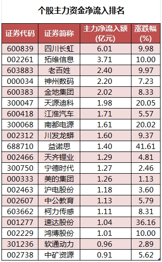 个股来看,今日有2191个股获主力资金净流入,其中,18股获主力资金净流入超1亿元。四川长虹主力资金净流入最多,净流入金额为6.01亿元;主力资金净流入居前的个股还有拓维信息、老百姓、神州数码、金地集团、天源迪科,净流入金额分别为3.71亿元、2.4亿元、2.2亿元、2.02亿元、1.98亿元。