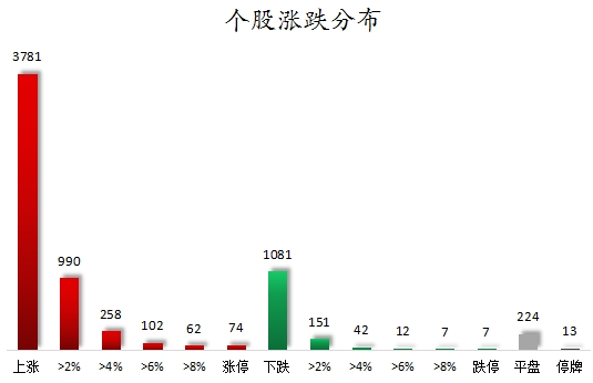 个股涨跌情况,截至收盘,沪深两市合计3781只个股上涨,1081只个股下跌,平盘个股224只,停牌的个股13只。不含当日上市新股,共有74只个股涨停,7只个股跌停。