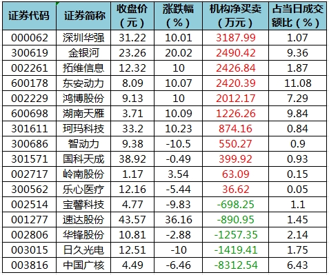 盘后龙虎榜数据显示,今日机构席位资金合计净卖出约3109.63万元。其中,净买入的个股11只,净卖出的个股5只。机构净买入最多的股票是深圳华强,净买入金额约3187.99万元。机构净买入的还有金银河、拓维信息、东安动力等股。机构净卖出最多的股票是中国广核,净卖出金额约8312.54万元;机构净卖出居前的还有日久光电、华锋股份等股。