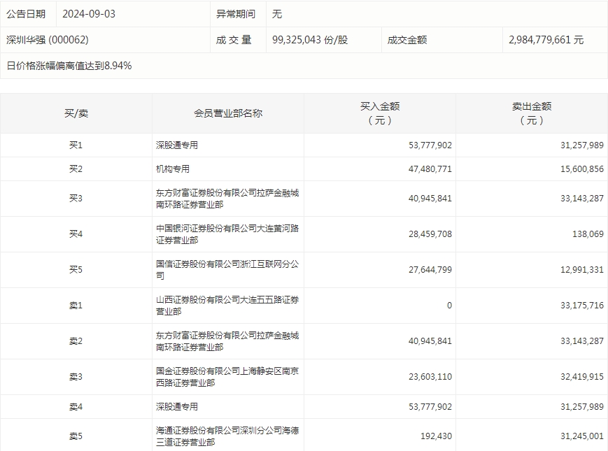 深圳华强今天涨停。盘后数据显示,1家机构出现在龙虎榜单上,净买入3187.99万元;中国银河证券股份有限公司大连黄河路证券营业部买入2845.97万元,同时卖出13.81万元;国金证券股份有限公司上海静安区南京西路证券营业部买入2360.31万元,同时卖出3241.99万元。