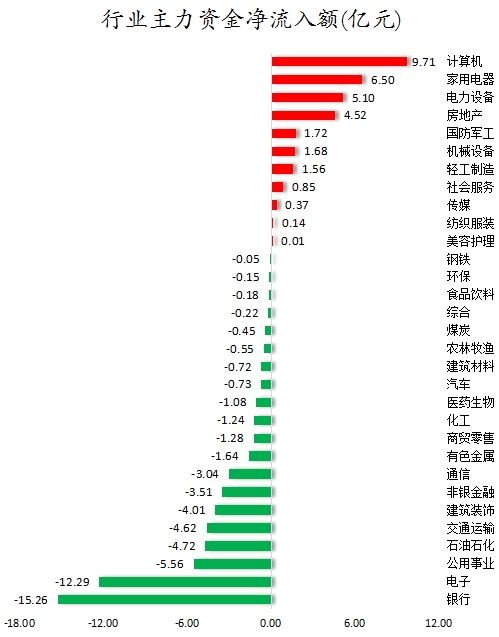 从行业来看,申万所属的31个一级行业,今日有11个行业主力资金呈现净流入,其中,计算机行业主力资金净流入最多,净流入金额为9.71亿元;行业主力资金净流入居前的还有家用电器、电力设备、房地产,净流入金额分别为6.5亿元、5.1亿元、4.52亿元。20个行业主力资金呈现净流出,其中,银行行业主力资金净流出最多,净流出金额为15.26亿元;行业主力资金净流出靠前的还有电子、公用事业、石油石化、交通运输、建筑装饰,净流出金额分别为12.29亿元、5.56亿元、4.72亿元、4.62亿元、4.01亿元。