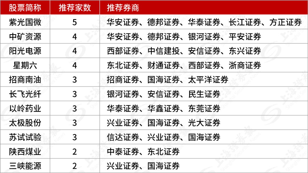 此外,中矿资源、阳光电源等个股推荐家数紧随其后。陕西煤业、招商南油等周期股也获得多家券商共同推荐。