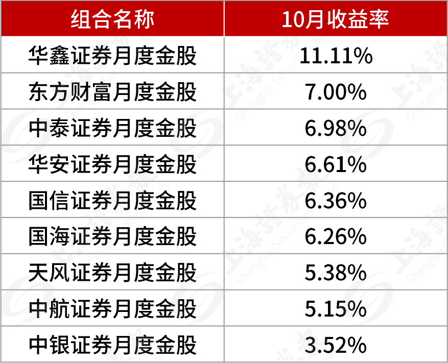 10月金股“成绩单”出炉,据每市数据统计,华鑫证券的金股组合收益率排第一位,整体上涨11.11%。东方财富、中泰证券分列二、三位。华安证券、国信证券金股组合的收益也排在前列。