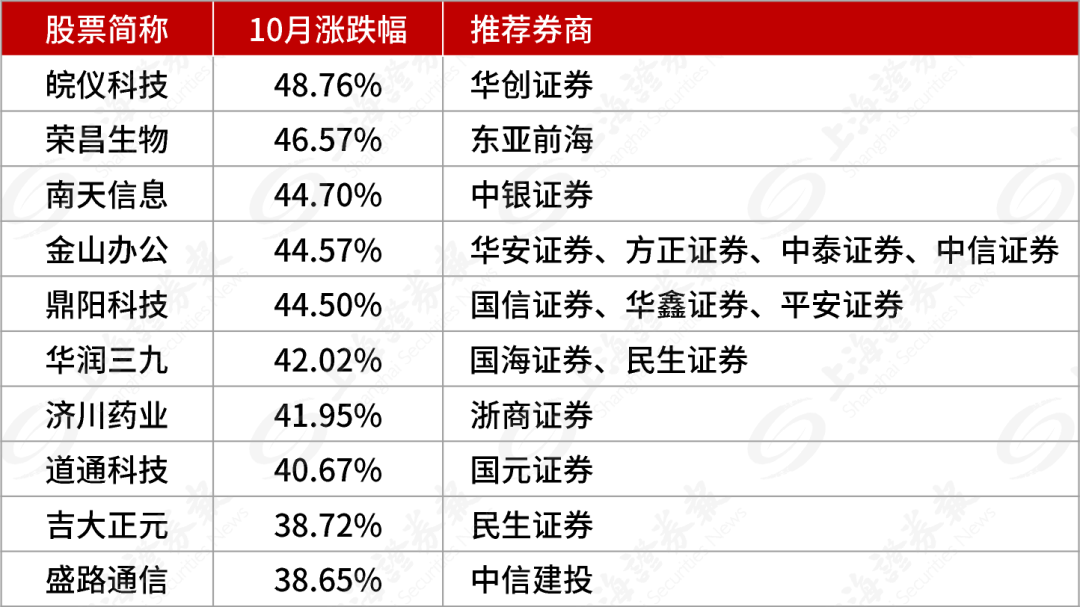 个股方面,在券商的“金股池”中,华创证券推荐的皖仪科技10月份上涨48.76%,东亚前海推荐的荣昌生物上涨46.57%,中银证券推荐的南天信息上涨44.70%。