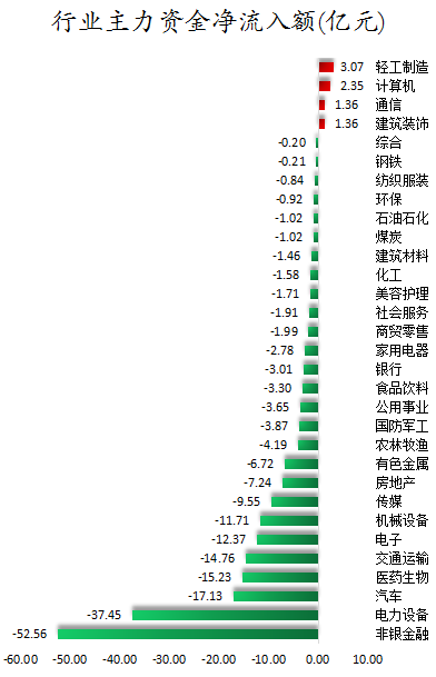 从行业板块来看,申万所属的31个一级行业,今日仅有轻工制造、计算机、通信、建筑装饰4个行业板块主力资金呈现净流入,净流入金额分别为3.07亿元、2.35亿元、1.36亿元、1.36亿元。27个行业板块主力资金呈现净流出,其中,非银金融行业板块主力资金净流出最多,净流出金额为52.56亿元;行业板块主力资金净流出靠前的还有电力设备、汽车、医药生物、交通运输、电子、机械设备,净流出金额分别为37.45亿元、17.13亿元、15.23亿元、14.76亿元、12.37亿元、11.71亿元。