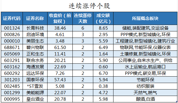 截至收盘,沪深两市合计1341只个股上涨,3540只个股下跌,平盘个股160只,停牌的个股4只。不含当日上市新股,共有38只个股涨停,7只个股跌停。连续涨停天数看,长青科技已连收6个涨停板,连续涨停板数量最多。