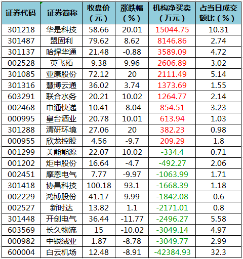 盘后龙虎榜数据显示,今日机构席位资金合计净卖出约2.24亿元。其中,净买入的个股11只,净卖出的个股10只。机构净买入最多的股票是华是科技,净买入金额约1.5亿元;机构净买入的居前还有盟固利、哈焊华通、英飞拓、亚康股份、慧博云通等股。机构净卖出最多的股票是白云机场,净卖出金额约4.24亿元;机构净卖出居前的还有中银绒业、长久物流、开创电气等股。