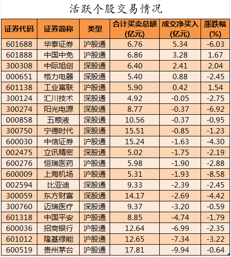 活跃个股方面,北向资金今日净买入的有华泰证券、中国中免、中际旭创、格力电器、工业富联,净买入金额分别为5.34亿元、3.28亿元、2.41亿元、0.88亿元、0.42亿元。北向资金净卖出较多的有贵州茅台、隆基绿能、招商银行、中国平安、迈瑞医疗,净卖出金额分别为9.94亿元、7.34亿元、6.99亿元、4.74亿元、3.2亿元。