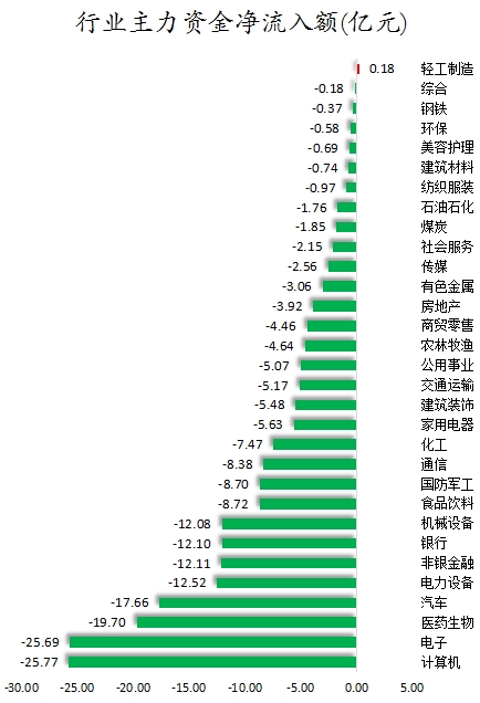 从行业来看,申万所属的31个一级行业,今日仅有轻工制造1个行业主力资金呈现净流入,净流入金额0.18亿元。30个行业主力资金呈现净流出,其中,计算机行业主力资金净流出最多,净流出金额为25.77亿元;行业主力资金净流出靠前的还有电子、医药生物、汽车、电力设备、非银金融、银行,净流出金额分别为25.69亿元、19.7亿元、17.66亿元、12.52亿元、12.11亿元、12.1亿元。