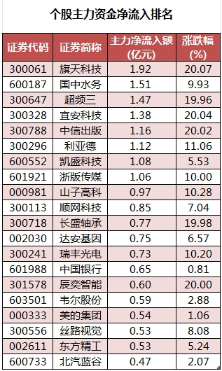 个股来看,今日有1663只股获主力资金净流入,其中,8股获主力资金净流入超1亿元。旗天科技主力资金净流入最多,净流入金额为1.92亿元;主力资金净流入居前的个股还有国中水务、超频三、宜安科技、中信出版、利亚德,净流入金额分别为1.51亿元、1.47亿元、1.38亿元、1.16亿元、1.12亿元。