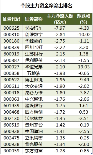 此外,3379只个股被主力资金净卖出,其中,34股被主力资金净卖出超1亿元。主力资金净流出最多的个股是长安汽车,净流出金额为7.97亿元;主力资金净流出居前的个股还有创维数字、华峰超纤、四川长虹、江苏银行、伊利股份,净流出金额分别为2.84亿元、2.75亿元、2.22亿元、2.15亿元、2.13亿元。