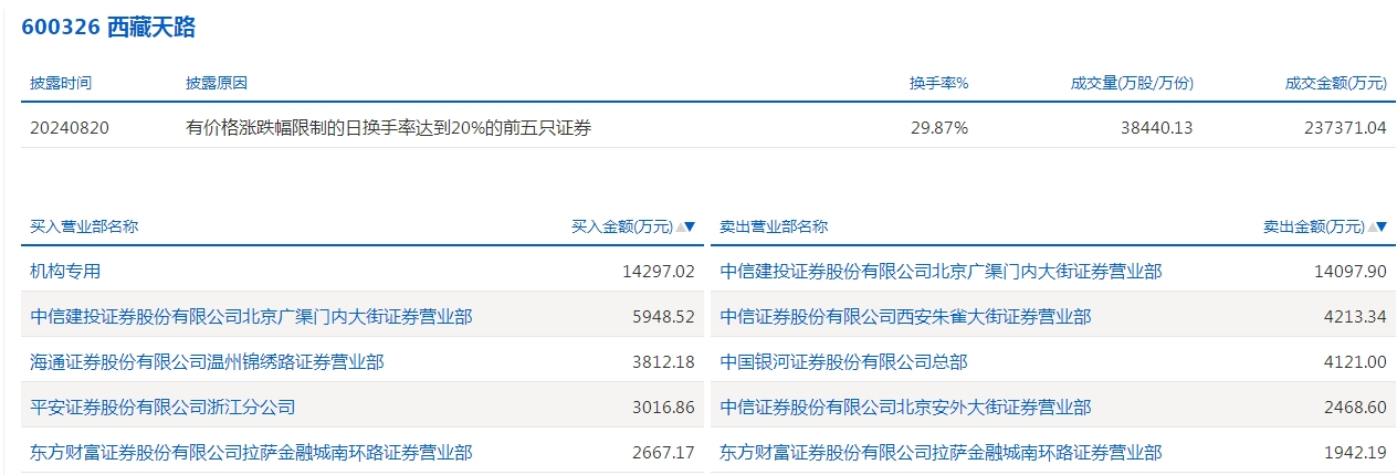 西藏天路今天涨7.12%。盘后数据显示,1家机构出现在龙虎榜单上,净买入1.43亿元;中信建投证券股份有限公司北京广渠门内大街证券营业部买入5948.52万元,同时卖出1.41亿元;海通证券股份有限公司温州锦绣路证券营业部买入3812.18万元。