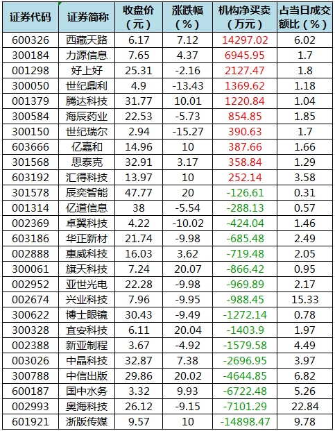盘后龙虎榜数据显示,今日机构席位资金合计净卖出约1.72亿元。其中,净买入的个股10只,净卖出的个股16只。机构净买入最多的股票是西藏天路,净买入金额约1.43亿元;机构净买入的还有力源信息、好上好等股。机构净卖出最多的股票是浙版传媒,净卖出金额约1.49亿元;机构净卖出居前的还有奥海科技、国中水务、中信出版等股。