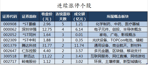 截至收盘,沪深两市合计527只个股上涨,4502只个股下跌,平盘个股60只,停牌的个股11只。不含当日上市新股,共有37只个股涨停,14只个股跌停。连续涨停天数看,*ST景峰已连收5个涨停板,连续涨停板数量最多。