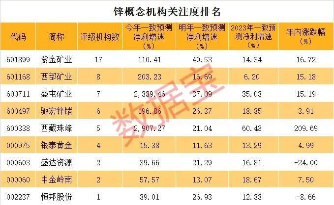 整体来看,A股市场上合计有18只锌概念股。机构关注度最高的是紫金矿业,有17家机构评级,一致预测今年净利增速超过110%。此外,西部矿业、盛屯矿业、驰宏锌锗等个股均有5家以上机构评级。值得一提的是,盛屯矿业、西藏珠峰两只个股,今年、明年及2023年机构一致预测净利增速均超过20%,其中盛屯矿业净利增速均超30%。