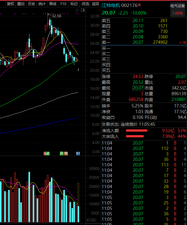 在此消息影响下,江特电机今天开盘巨量跌停,盘中打开后再度跌停。截至上午收盘,该股报20.07元,下跌10%,跌停板上封单超27万手。江特电机是本轮新能源牛市标志性牛股之一,去年最低价1.25元,近期最高价超32元,期间最大涨幅超25倍。