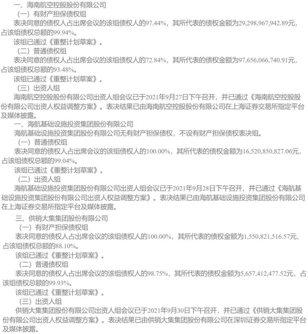 此外,海航基础、海南航空、供销大集的《重组计划草案》的表决结果也对外公布。