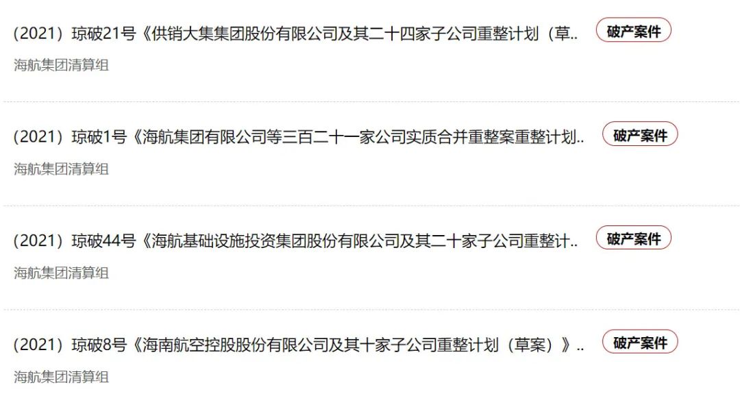 公告显示,10月23日15时,海南省高级人民法院(以下简称“海南高院”)组织联合工作组、管理人、债权人代表、出资人代表、债务人代表及职工代表等各相关方,对《海南航空控股股份有限公司及其十家子公司重整计划(草案)》《海航基础设施投资集团股份有限公司及其二十家子公司重整计划(草案)》《供销大集集团股份有限公司及其二十四家子公司重整计划(草案)》《海航集团有限公司等三百二十一家公司实质合并重整案重整计划(草案)》等海航集团及相关企业破产重整案的各重整计划草案表决情况进行核查。