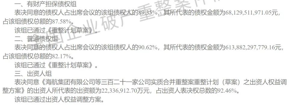 按照《中华人民共和国企业破产法》第八十四、八十六条的规定,根据核查结果,海航集团及相关企业破产重整案的各重整计划(草案)均已获得表决通过。