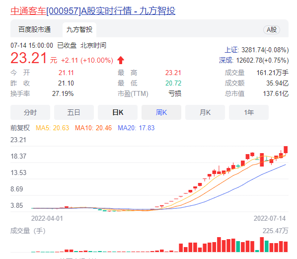 其中中通客车尾盘竞价封板,5月13日至今累积涨幅超430%。